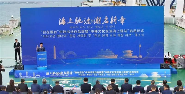 Jiaodong.Net, September 22, 2025 (Reporter: Jia Chuhang) – On September 22, 2025, the launching ceremony of “Free Yantai” China-South Korea Calligraphy Exhibition and China-South Korea Cultural Exchange Maritime Station was held aboard the Yantai China-South Korea Ferry “XIN XIANG XUE LAN”.